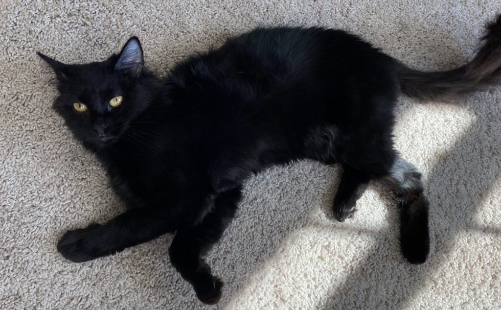 Amilyn is a pretty lady with a long body, a long tail and soft fur. She loves to play – plastic balls, catnip mice, and her favorite – spring coil toys. She sometimes makes crying noises while she carries her toys around in her mouth (“look what I hunted and caught!”). She loves to run around the house and play with her foster sisters. She also enjoys the screened in porch. Amilyn would do best with another cat. Amilyn is a nice girl and will sometimes sit in your lap after she gets to know you. And she is fond of getting to know you while being brushed, especially under her chin. While she does like being petted and receiving chin scratches, she does not like being picked up. She will come stand on her hind legs and vocalize when she wants attention. Amilyn is very shy initially and may take some time to settle in and feel comfortable, so will need a patient adopter.
